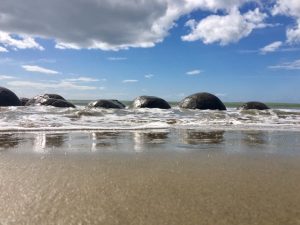 The drive up to Christchurch across the Canterbury Plains is quick on a good road. We stopped for a break to take a look at the Moeraki Boulders. Maori legend tells that the boulders are remains of calabashes, kumaras and eel baskets that washed ashore after the legendary canoe, the Araiteuru was wrecked at nearby Shag Point. In reality they are mud balls that have hardened underground over millions of years, and, as the coastline erodes, they appear and fall on to the beach. Once exposed to the air and water they begin to disintegrate. It doesn’t help that tourists clamber all over them.
