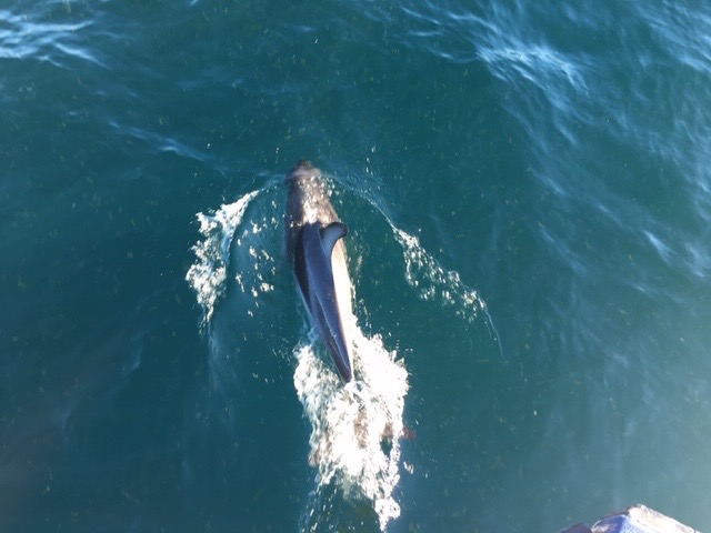 Later we saw a pod of dolphins heading out to sea to feed. They were fantastic, the way they swam around the bows of our boat, coming up between the twin hulls. After entertaining us for some time they headed off. Standing at the bow, I was still on the lookout for dolphin when there was a commotion in the water. We had disturbed a Blue shark, which appeared to be sleeping and only realised we were on top of it at the last minute. It was about eight feet long and, once it was awake, was off like a shot.