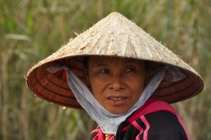 The following morning Mr T took us, on our bus, to visit Phat Diem Cathedral. This area of Vietnam has quite a significant Catholic population and the landscape, en route to Phat Diem, is littered with churches. The landscape was now very flat with massive paddy fields disappearing as far as the eye could see, all fed by a network of canals. Much of this area had once been submerged but with the careful management of a canal system the land was reclaimed. Thousands of tons of limestone had to be transported to create a firm foundation for the cathedral, built in the late 1800s. The stone for the construction had to be transported some 120 miles along with timber from hundreds of ironwood trees. Although it is a cathedral, upturned pagoda styled roofs were placed on top of the towers, giving it a unique appearance.