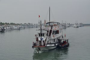 I was really looking forward to Halong Bay as it had been on my wish list for many years. Before we boarded our boat we had to visit a pearl emporium where we were shown how the irritation was placed in the flesh of the oyster in order for a pearl to form. We also observed how the pearl was taken out. I was amazed to learn that a single oyster could go through the pearl producing process three times. Having watched the process, we were then ushered into the shop. That is when I switched off. It was large, very well staffed with sales people everywhere. Unfortunately, pearls leave me cold and the prices asked added to my lack of enthusiasm. I didn’t really need this distraction, this delay. I wanted to get on the water and sail among the towering pillars of Halong Bay.