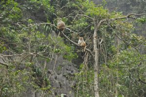 Further on we came to a low cave that just allowed us access to its darker corners before the roof became too low. Emerging from the cave we looked up and there we spotted some large black monkeys with, what looked like, white nappies around their bottoms. They were Delacour’s Langurs, a seriously endangered species. There are only about 250 left in the world and during the course of our observation, we saw about 12. They have extremely long tails which help give them balance as the nimbly run across the limestone cliffs.