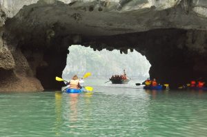 Weaving our way through narrow passages of water, we were not alone. There were many more junks on the water heading out to our eventual destination, a mooring area across the water from Titov Island. Once we were moored we boarded our tender to take us to a landing stage before the entrance to Luon Cave. here, we had a choice of either hiring two-man canoes or being taken there on a large sampan. Most of us chose the canoe option.