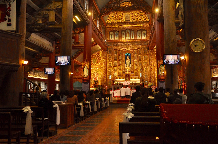Before we entered the Cathedral we could hear singing. A wedding was taking place. The atmosphere inside was relaxed and the singing beautiful. Obviously, we kept a respectful distance from the ceremony but nobody seemed to mind us being there and taking photographs. All along the nave, huge ironwood pillars supported the wooden vaulted ceiling. The area behind the altar was ornately gold the centre piece being a statue of Mary and baby Jesus with a blue neon halo and ‘Ave Maria’ above her head. It was all slightly gaudy.