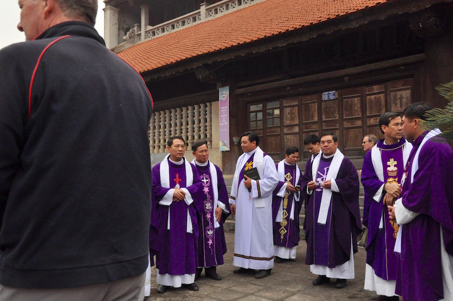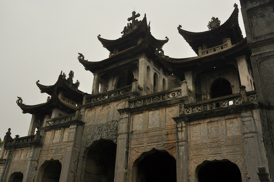 The following morning Mr T took us, on our bus, to visit Phat Diem Cathedral. This area of Vietnam has quite a significant Catholic population and the landscape, en route to Phat Diem, is littered with churches. The landscape was now very flat with massive paddy fields disappearing as far as the eye could see, all fed by a network of canals. Much of this area had once been submerged but with the careful management of a canal system the land was reclaimed. Thousands of tons of limestone had to be transported to create a firm foundation for the cathedral, built in the late 1800s. The stone for the construction had to be transported some 120 miles along with timber from hundreds of ironwood trees. Although it is a cathedral, upturned pagoda styled roofs were placed on top of the towers, giving it a unique appearance.
