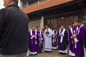 From outside, more singing could be heard, and now it was competing with the wedding ceremony. There was a funeral taking place. It seemed strange that there should be two completely different services competing with each other. Walking by the funeral, it looked as if it might be that of a priest as there were so many frocked clergy participating.