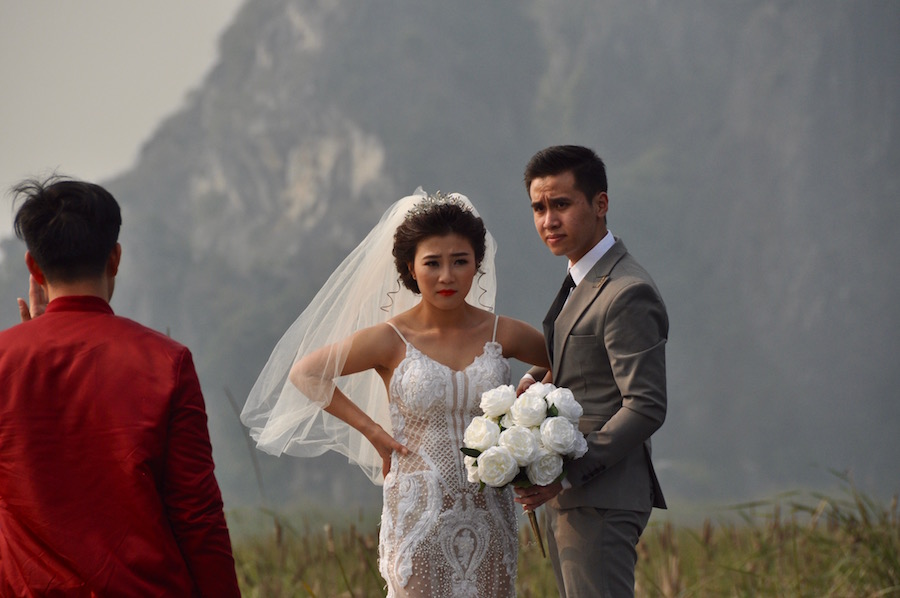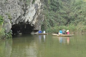 After lunch we headed down to an area known as Tam Coc (Halong Bay on Land) for a boat trip. Waiting on the water were a number of sampans, largely paddled by women, to take us on a journey through the quiet waters with limestone cliffs rising vertically above them. Initially, we paddled through channels among reeds. As we did so, we came across a bride and her groom, in full wedding gear, standing on a sampan while a photographer on another sampan took their pictures.