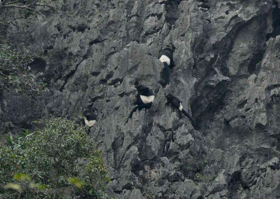 Further on we came to a low cave that just allowed us access to its darker corners before the roof became too low. Emerging from the cave we looked up and there we spotted some large black monkeys with, what looked like, white nappies around their bottoms. They were Delacour’s Langurs, a seriously endangered species. There are only about 250 left in the world and during the course of our observation, we saw about 12. They have extremely long tails which help give them balance as the nimbly run across the limestone cliffs.