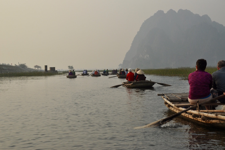 The drive to Ninh Binh became more interesting the closer we got. Having left the mountains behind us we travelled through a very flat landscape of expansive paddy fields, big enough for machinery to plough and prepare rather than bent double men and women. Great sluggish rivers cut their way through the flat landscape. At various points along their length, large barges were moored, home for the Tet Festival. Normally these barges ply their way up and down stream carrying a wide variety of cargoes, but mainly sand and limestone for building purposes. Then, out of the haze, enormous towers of vertical rock emerged. There were no preparatory hills gradually increasing in size, just great lumps of limestone karst scenery. As soon as it appeared, it disappeared again, making way for more flat, watery paddy fields. Again, the karst scenery reappeared and by the time we reached Ninh Binh, the town was surrounded by these strange outcrops. The view from our room on the 7th floor of the hotel looked out on to the building below, dwarfed by the towering blocks of limestone. That night we ate in at the Nam Hoa Hotel.