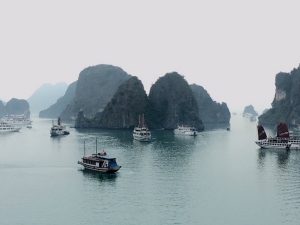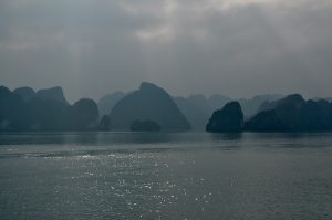Our time in Halong Bay was coming to an end. Once we had finished in the cave our tender took us back to our junks and we soon set off on the return journey to Halong City. It was still grey and murky but it did not diminish the splendour or the impact of the rocky pillars. It may have diminished their features but they were swathed in far more atmosphere.