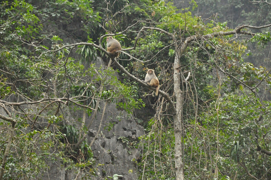 Luon Cave is a low arch leading into a hidden lagoon of enormous proportion. Once through, you are faced with a circle of vertical, or near vertical rock and vegetation, which enhanced, yet muted, the voices of the people paddling around. We paddled fairly close to the cliffs in the hope of seeing some of the golden monkeys that are reputed to live around the lagoon. We were just about to leave, when we saw some, so we paddled across to take a closer look as they sat in a tree watching us watch them.