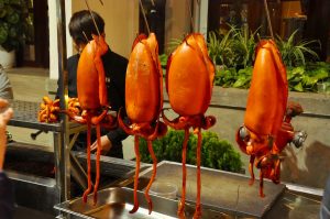 There were also some interesting items of food for sale, including some very lurid, orange octopus and some weird and wonderful fruit. Where there was not a colourful stall of some description blocking the pavement, motorcycles were parked, forcing us all the time to walk in the road. Remarkably, we did not come into contact with any traffic. Similarly, if we needed to cross a wider road we simply walked at a steady and regular pace, confident that the traffic would work its way around us. If we tried to run or to change our pace we would be introducing unpredictability into the operation and an accident would be much more likely.