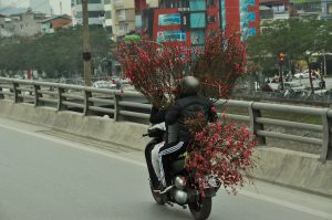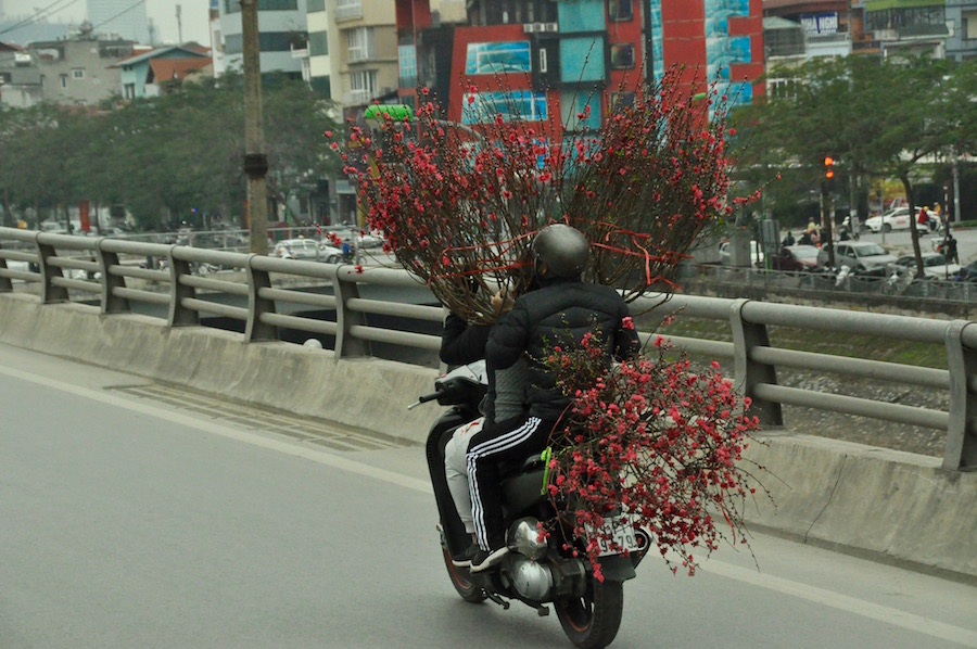 The flight had gone so smoothly it was a disappointment that we then faced a two-hour delay while our visas were sorted. Despite the fact that we had all completed the forms correctly, they seemed to be more concerned as to who was actually meeting us on the other side of passport control. After a lengthy phone call to the Asia Aventura office they began to process our passports and eventually let us proceed to passport control and to our luggage waiting on the other side where we were also met by our guide, Thanh, better known as “T”. It was now plain sailing to the hotel, although the closer we got to the town centre the more congested the traffic became, particularly with motorcycles, of which there were thousands. The population of Hanoi is 8 million and there are reportedly 7 million motorbikes. As the Tet Festival (Vietnamese New Year) was approaching some motorcyclists were precariously carrying large branches of cherry blossom or potted orange trees.