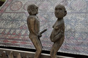 Outside, and probably far more impressive were, reconstructions of tribal houses. These were large and provided homes for extended families. While there were two very impressive traditional stilt buildings, a long house and a very tall house, the building that took most of our attention was the burial chamber with its collection of sexually explicit wooden statues all around it. They left nothing to the imagination!