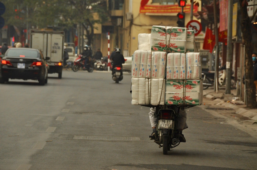 After breakfast Mr T met us for the start of our Hanoi city tour. The streets surrounding our hotel were too narrow for the bus to pick us up, so we walked a short distance to a main thoroughfare. Now, in full light of day, we could see the true impact that the motorbike has on the roads of Hanoi. At every traffic light there was a sea of motorbikes of all shapes and sizes. Some were carrying impossibly large loads, piled high and wide behind the driver. Others carried long items that jutted out in front by several feet and trailed behind by even more. It made the journey interesting looking for the most bizarre load or the bike with the most riders. Five was a maximum, but it did not stop us looking for six!