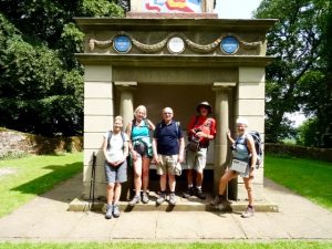 We descended briefly to Lower Redbrook for lunch by the river, before climbing yet again, through pastureland to Kymin. At the top of the hill is a round house, built by the gentlemen of Monmouth as a place to meet and dine. The adjacent Naval Temple was built in 1800 to commemorate the naval victory in the Battle of the Nile in 1798, and other similar naval battles. Admiral Nelson visited it in 1802.