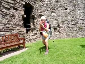 For lunch we sat on grass surrounded by an ancient moat, where once had stood a medieval Manor House. Unfortunately, for the next couple of miles the path was diverted along a lane because of overhead power line work, but as this gave us the short side of a triangle to walk, nobody really complained. This brought us to White Castle, which is one of the castles that featured on the Three Castles Way. When we visited it a few years ago there was an entry charge but that now seems to be a thing of the past. It is the largest of the three castles, the other two being Skenfrith and Grosmont. Inside we found a child’s toy gun which gave Claire some fun as she shot David and me with a large, orange sponge bullet!