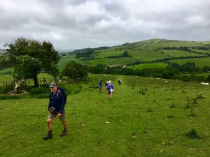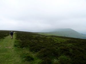 Our final day’s walk before we moved camp saw us climbing out of Pandy on the the long, open moorland path that took us the length of the Black Mountains towards Hay. Although this took us to the highest point along the whole of the Offa’s Dyke trail, it is not necessarily the most interesting, and the fact that for much of the day cloud hung about just above our heads meant that whenever there were possible far reaching views, they were limited. Quite a strong breeze kept the temperatures down, making it perfect walking weather. We made very good time and were back at the minibus at the foot of Hay Bluff, at 2.00pm. Plenty of time for us to call into the bar at Llanthony Priory for some refreshing tea!