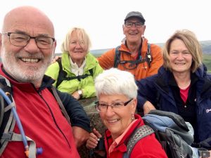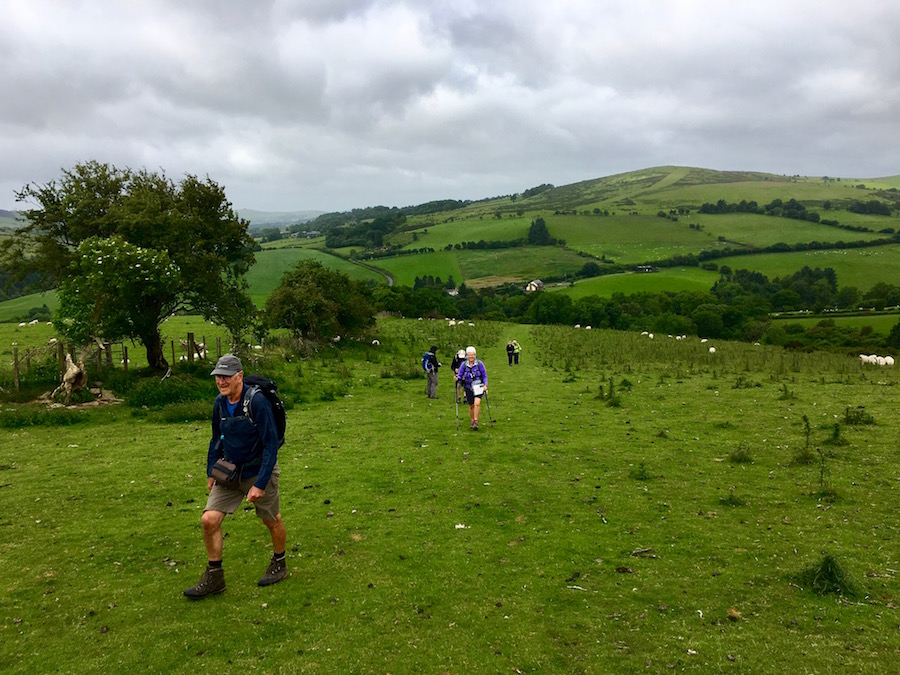 A slight deterioration in the weather greeted us for our last walking day. It must have been Tina’s fault, who joined us for the last day. A touch of overnight and early morning rain meant, that for the first time during the week, I needed to wear boots in order to keep my feet dry. Until the weather improved the long grass was going to hold droplets that would quickly soak through trainers. Also, gone were the clear views that we had so enjoyed so far. The first half of the walk up to the ridge above Knighton and along to Cwm-sanaham Hill was lovely, and, although we were walking along visible stretches of the dyke, much of the path beyond was tedious under foot. It was strewn with masses of sheep poo, which we tried our best to avoid. Nevertheless, we made good progress and reached the minibus, parked in the village hall car park in Newcastle-on-Clun, in time for a late lunch. We preferred to sit on the dry seats of the bus in preference to the wet grass.