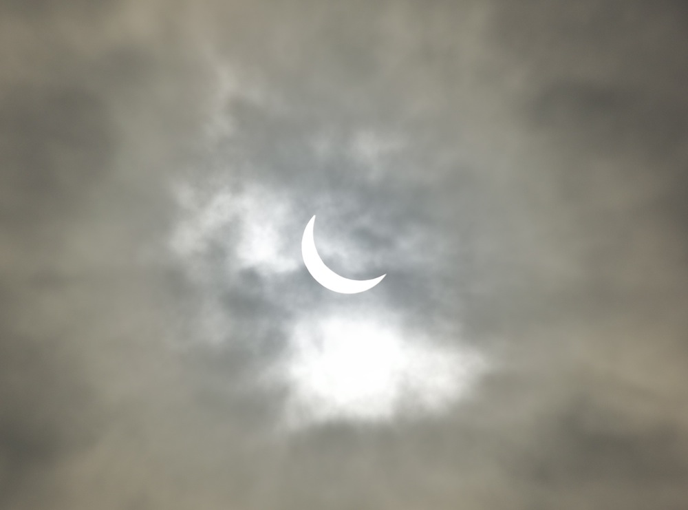 On Friday 20th March a thin layer of cloud hovered over Worcester as I prepared for a weekend camp at the Old Chapel. I was meeting Caz from NCW at 10.30 so that we could visit Tesco together and buy all the necessary supplies for the weekend. At about 9.30 the light outside dimmed as though night were approaching. Looking up at the sky the sun was reduced to a perfect crescent as the moon passed in front of it. The thin layer of cloud enabled me to look directly at the eclipse and photograph it without fear of doing my eyes or the eye of the camera any harm. Part way through the phenomena the clouds cleared and it became impossible to see anything other than a brilliance in the sky. All definition was lost and gradually the light brightened as the moon moved away.