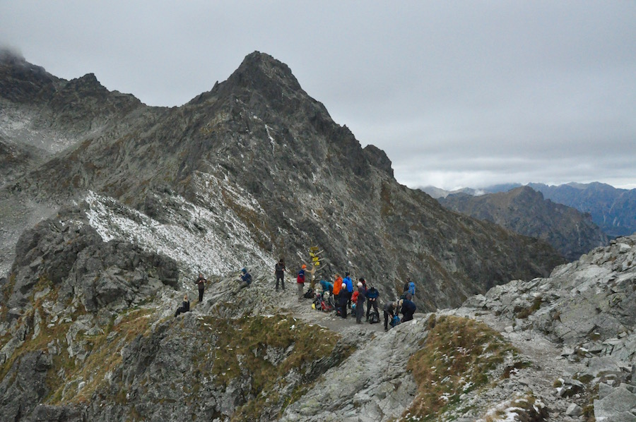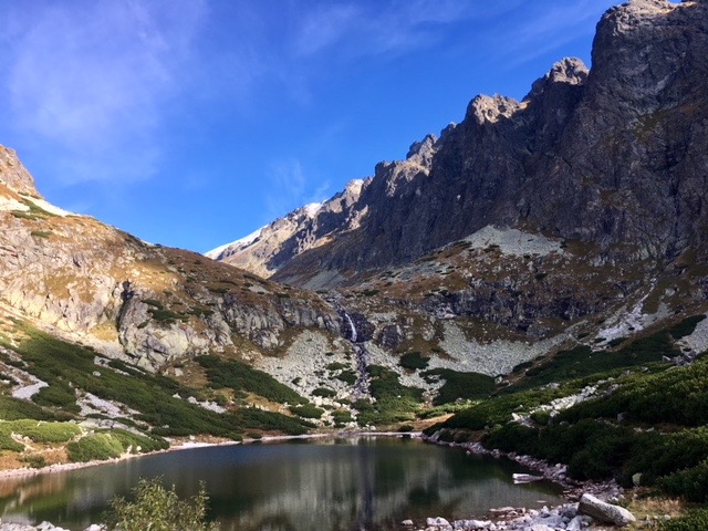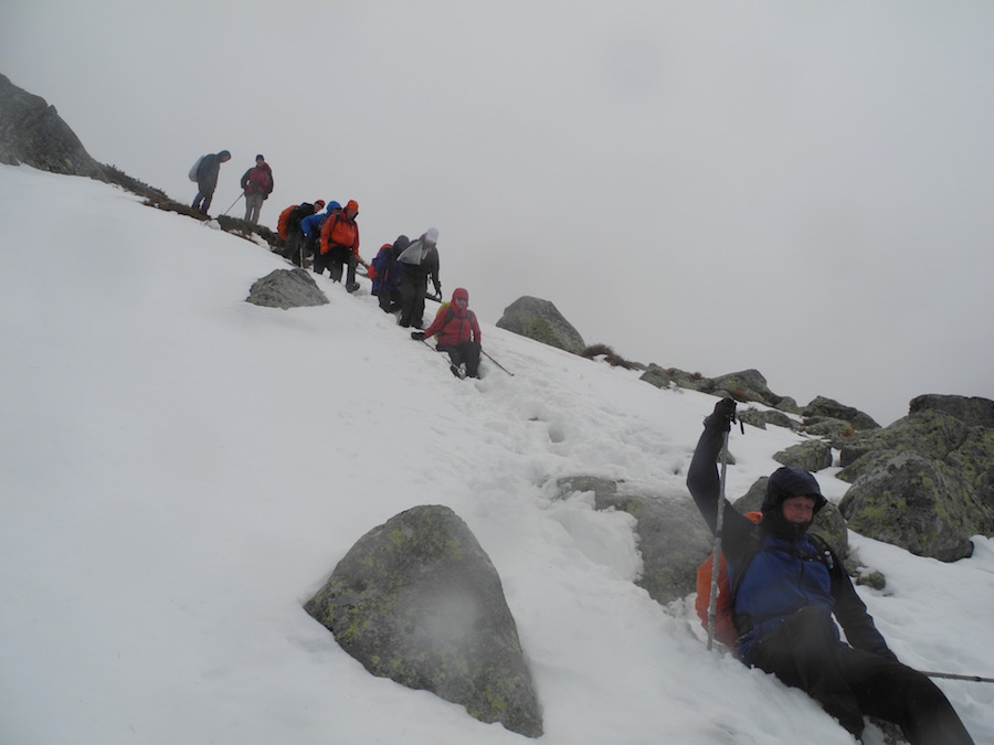 On a much brighter morning a landrover picked us up in Tatranská Poliank and took us up 600m to the Horsky Hotel and the starting point for our climb. Ahead of us was a small lake with a waterfall sliding down the rocks from a hanging valley above. We were heading for Polsky Hreben (Polish Col). It was a steady climb over rocks all the way to the col. As we climbed, non-threatening clouds began to gather about the summits.