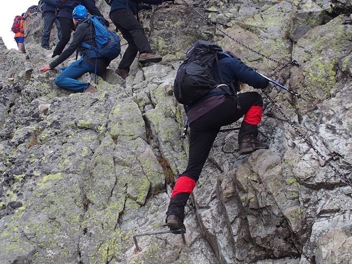 From the pass we had views to the plains of Poland to the north and Slovakia to the south. It made you realise just what a narrow chain of mountains the Tatras are. Either side of the col the rock climbed steeply to summits. While we rested and took some refreshment, we contemplated climbing the summit of Vychodna Vysoka (2429m) on the eastern side of the col. it looked steep and fairly exposed in places. I wasn’t sure how my knee would cope with the descent and as we had 1250m of descent from the col without the additional 250m from the peak, I regrettably decided not to go to the summit. It proved a wise decision as I was in some pain and discomfort during the descent. As it turned out, just four of the group ventured up to the summit, thoroughly enjoying both the challenge and the achievement.