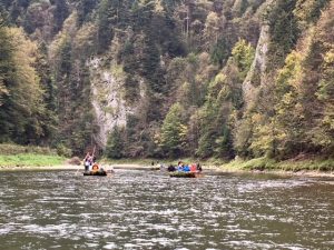 After breakfast we drove for about an hour to the village of Cerveny Klastor on the banks of the Dunajec River, the middle of which forms the border between Slovakia and Poland. Here we were to meet up with our rafts for a ninety minute journey down through the Dunajec Gorge. The rafts can best be described as a series of wooden canoes lashed together to create a very stable platform on which to travel. Two raftsmen help guide the raft front and back using long poles. Ours were a characterful pair with massive hands, probably the result of years handling the wooden poles. The one managing the front of ours was a real character, although he looked as if he could have featured in a novel or a film. He had long hair tied in two plaits, a bushy beard, a twinkle in his eye and a wicked sense of humour. As we travelled he would pass snippets of information to Marcel, who would translate into English, stories about the legends of the gorge.