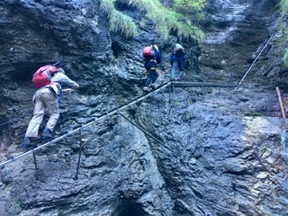 The lower section of the gorge tended to have wooden walkways – tree trunks laid flattish with wooden slats across them. Higher up these became metalled steps held into the rock with reinforcing rods drilled into the rock. And then, where the river plunged over a waterfall, we had metal ladders to climb. The angle of these varied considerably from vertical to 45 degree angles. It was really good and everybody thoroughly enjoyed the journey. There were no histrionics, no hesitation, just a determination to enjoy the experience.