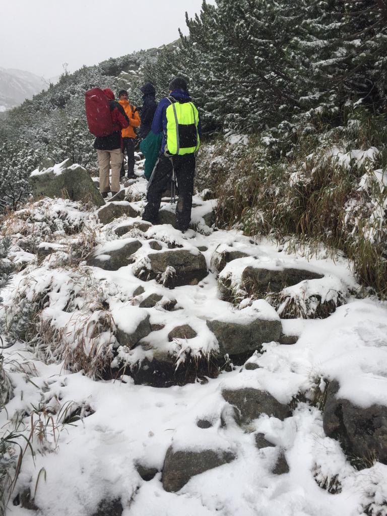 By the time we left the hut the rain had ceased and the clouds began to lift revealing precipitous rock faces leading up to a jagged skyline of freshly snowed upon summits. Wow, it was beautiful.