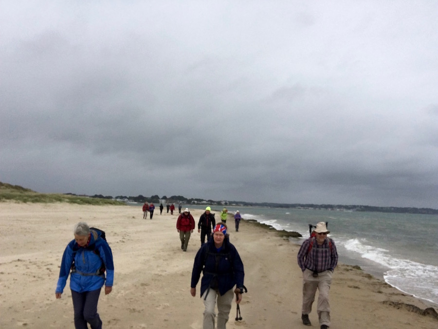After our compulsory start of day photo at the very eastern end of the Jurassic Coast Path, we headed out on to the beach to be hit by the full force of the wind. We were walking straight into the teeth of it. The soft sand beneath our feet made the going even harder. We soon headed towards the firmer wet sand at the water’s edge. It was also not long before we donned waterproofs as heavy, squally showers raced across the beach in the wind. The beach was virtually deserted, and there were certainly no naturists in the designated naturist section, unless they were hunkered down in the dunes at the back of the beach. I very much doubt it. Towards the southern end of the beach it became more populous with school groups on outings. What horrible conditions for them. I tried to give the teachers a sympathetic, knowing look but they were far too embarrassed to make eye contact.