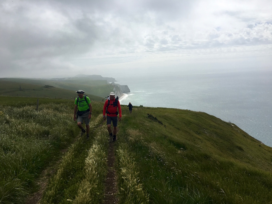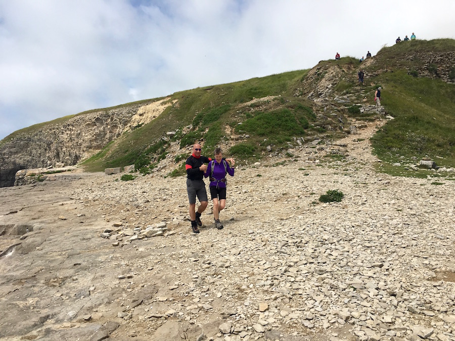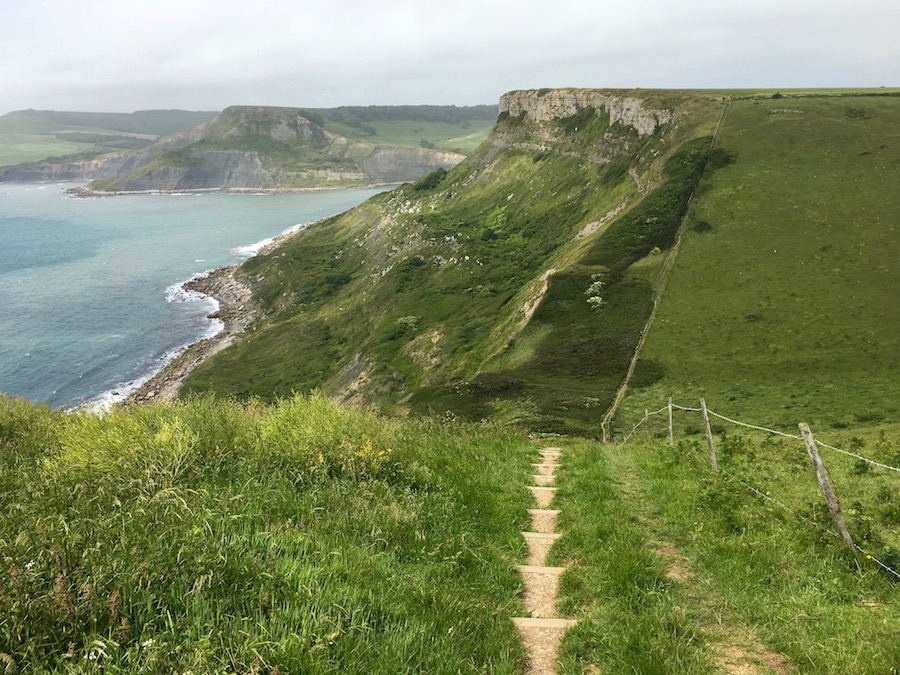 Around the corner we encountered our first major descent and ascent. The path dropped steeply by a series of steps, built specifically to make it easier for us but actually making the descent knee and ankle jerkingly difficult. The steps are not quite close enough together and they are too deep for comfort. Hence we tended to look like cripples hobbling our way down stairs. No sooner had we reached the bottom, the path reared straight back up via 182 slightly miscalculated steps, to the height we descended from only a few minutes earlier. This was the first of several such descents and ascents of the day, but none were quite as much of a shock as that first one after St. Alban’s Head. The motivation with all these ascents and descents is that they are not mountains; they are relatively short bursts of strenuous activity, we knew that after a few minutes we would reach flatter terrain. Collectively we were climbing mountains each day.
