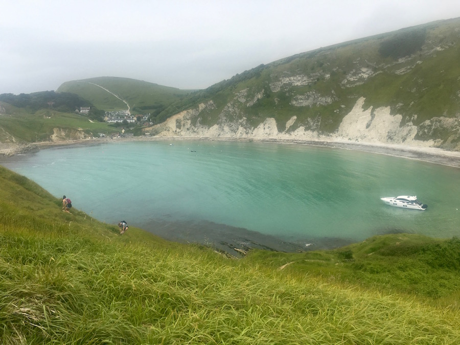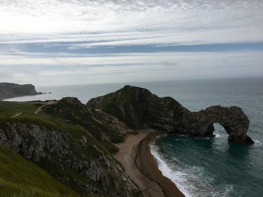 If I am honest, Lulworth Cove disappointed me. I don’t think the beach is the best vantage point, but the beach was disappointing. In photographs the water appears a pristine blue, but when we were there it was a grey/green. The beach looked untidy and a show-off in a rubber speed boat spoilt any potential peace and quiet. After lunch, when we walked round the beach to the village, it got no better. The road leading up from the beach smelt of rotting fish and sewage. And there were hordes of people. I couldn’t wait to get out, but the path covering the short distance between the cove and Durdle Door was similarly crowded, and not all the people were that pleasant, scoffing at us in walking kit.