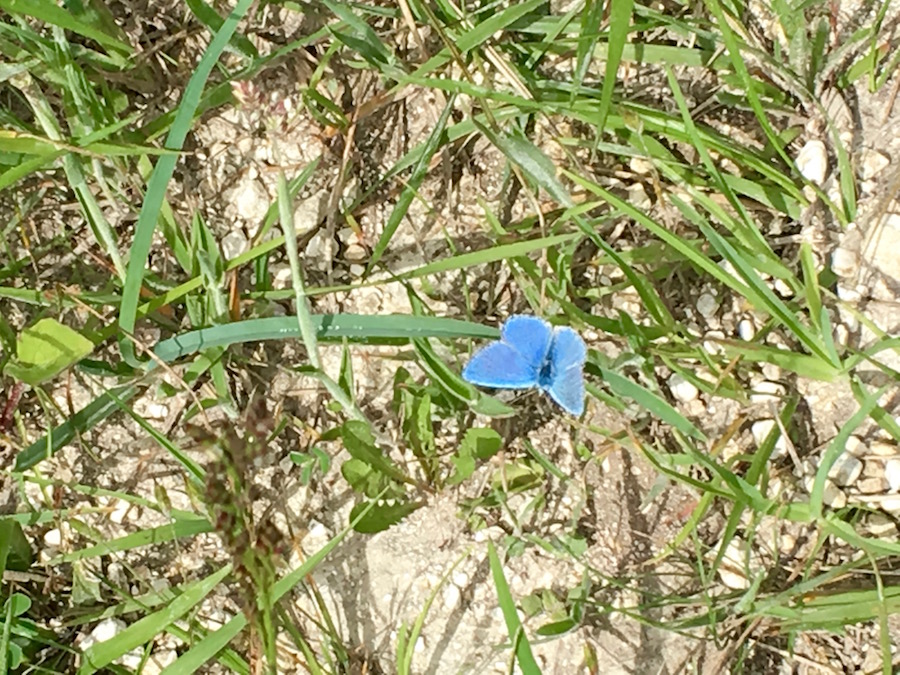 I have mentioned the solitary dolphin and seal, but I have not mentioned much in the way of land based creatures. The reason for that, we very rarely saw any. There were plenty of birds, skylarks, stonechats, chuffs and, of course, gulls, but very few mammals. We saw a mouse one day, occasional rabbits but not a lot else. The chalk downs and cliffs are home to a wide variety of flowers, although many of them were past their best when we were there. These attract plenty of insects and butterflies and we were pleased on this day to see a Blue Adonis that stayed still long enough for a photo.