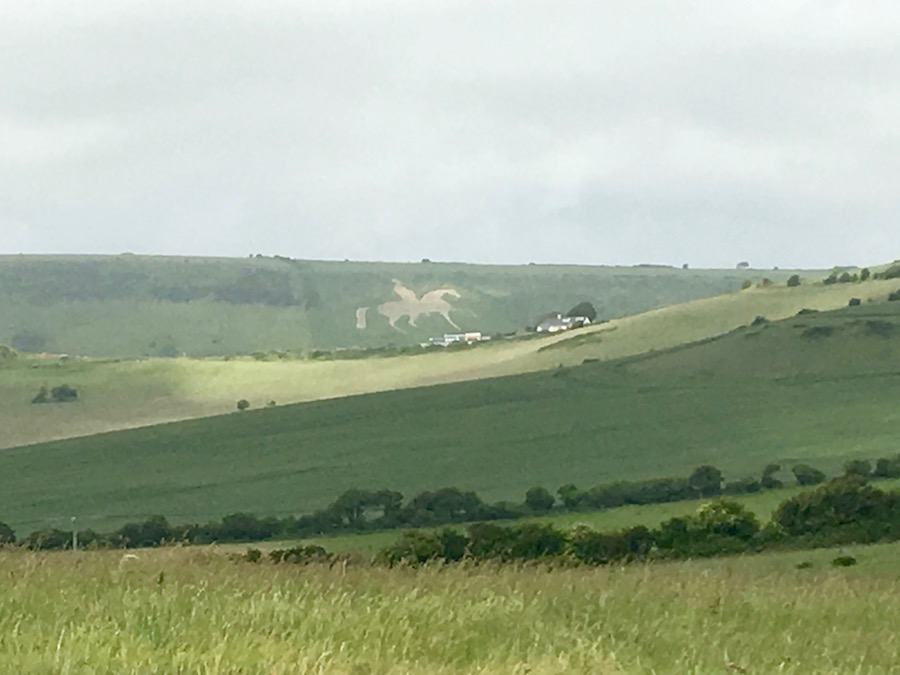 We were heading to Weymouth but before we got there we had to pass through Osmington Mills, not the village as that is slightly inland from the coast, but the area. We had driven through the village on a number of occasions to the start or from the finish of our walks on previous days. Whilst it is quite a pretty village, its main claim to fame is a horse and rider on a nearby hill. It was created in 1808 by cutting the thin turf to reveal the chalk beneath, and depicts King George lll, a regular visitor to Weymouth. From the cliff top we got a clear view of this magnificent chalk land carving.