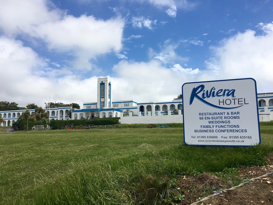 As we descended the cliff to walk the long sweep of Weymouth Bay we dropped in to Bowleaze, which had another remnant of a bygone age, the Art Deco Riviera Hotel, painted lovingly blue and white. Surrounding it was a rather austere institutional fence but it is still a fully functioning hotel with 98 chalet type bedrooms all brought up to date in a refurbishment programme. It too seemed quiet and deserted. Unless you like Art Deco it is a bit of an eyesore. Its beauty is not looking at it but looking at the sweeping Weymouth Bay from it.