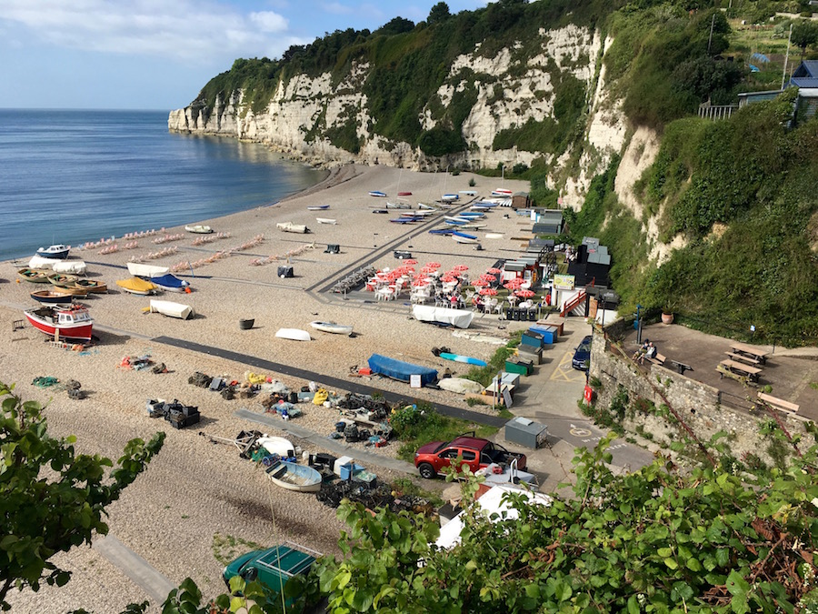 The departure from Seaton was a little messy with quite a bit of tarmac walking and no direct route. Almost as soon as we had climbed the cliff to the west of the town we began the descent into Beer, a very attractive village in a narrow valley leading to a delightful stony beach. Old conveyor belts had been placed over the pebbles to create walkways to the deckchairs, and little cafes on the upper edge of the beach. Small boats and fishing vessels sat at jaunty angles on the pebbles and there was a very relaxed holiday atmosphere about the place. We stopped for coffee at one of the cafes, which seemed to be used as much by locals as by holiday makers and ourselves.