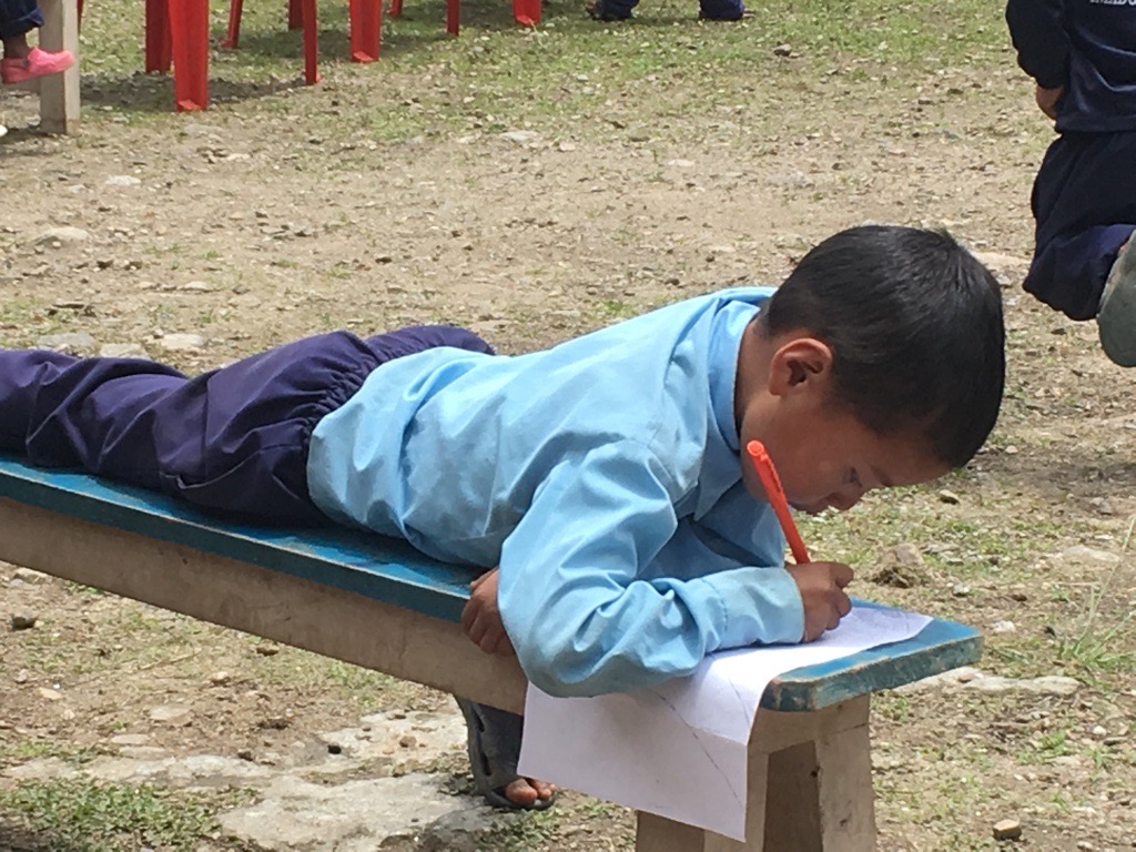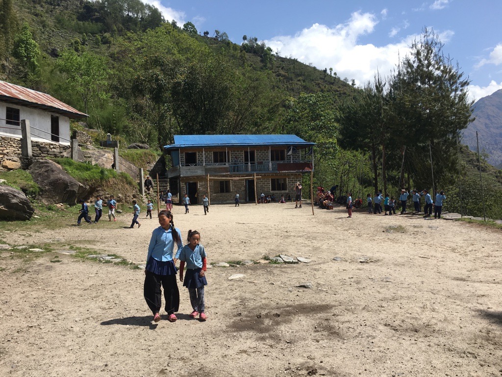 While Kate and the rest of the team stayed on at the health post, Tim, Mike and I went down to Phoktanglung School. We arrived in time for assembly on the playground. This was led by one of the older girls, but even so she could not have been any more than ten years old. She fulfilled her role with confidence as she first led the assembly and then the brain gym activities. Upon the conclusion the children set about going to their classrooms but before they settled to their work they swept out the rooms while other children litter picked around the playground and others filled buckets for the toilets. At no time did a member of staff have to tell them what to do. This was a daily routine and was very impressive.