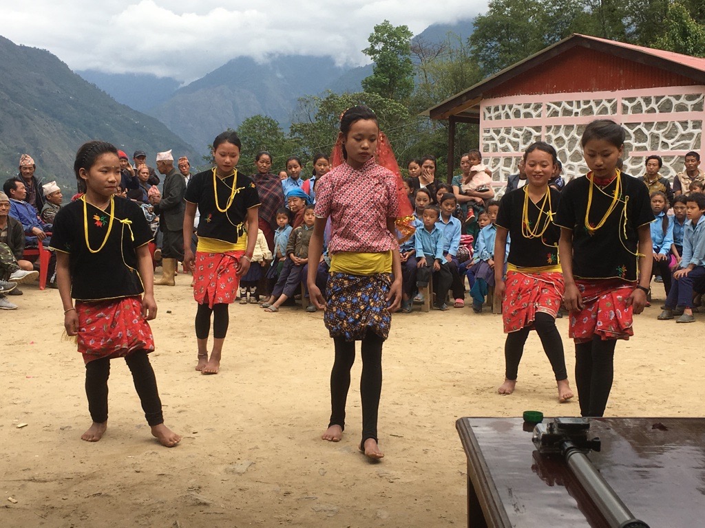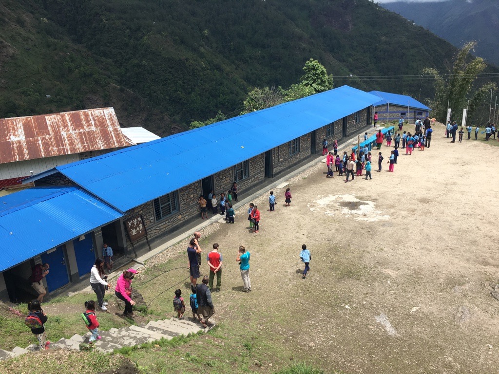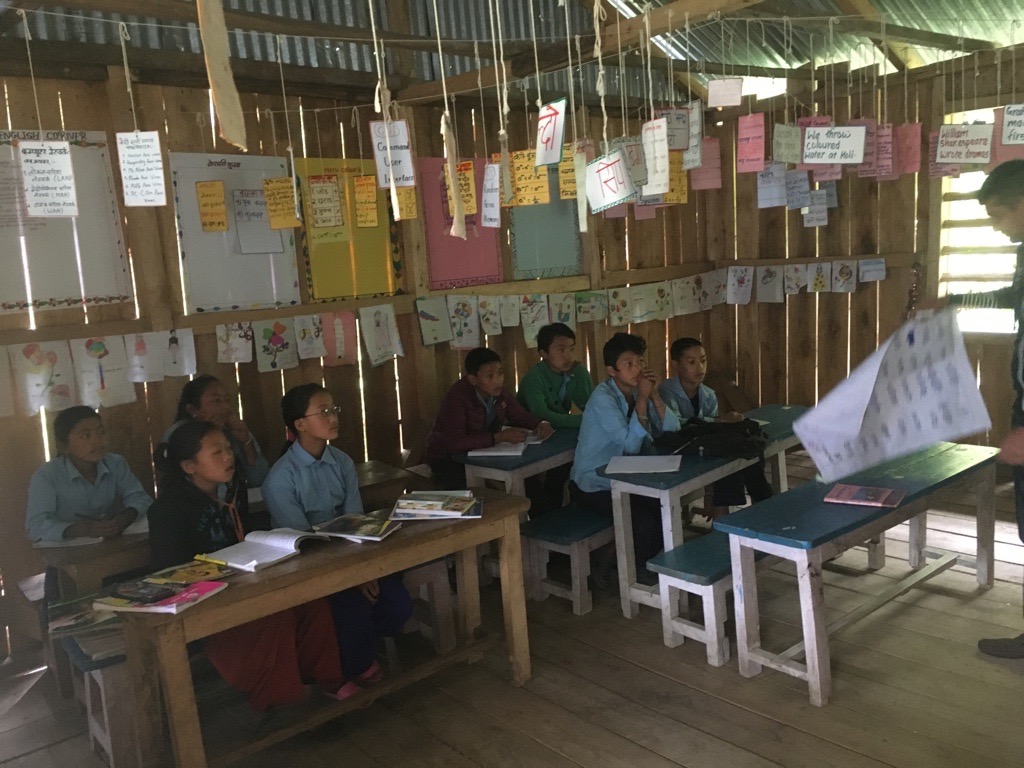 From Phoktanglung we headed up hill for an hour or so to reach Sewalung School. They too had had a rebuild programme following the earthquake, so this would be our fifth building opening ceremony. When we arrived the children were still in lessons so we had the opportunity to observe some lessons in the new classrooms we had built and also in the government funded classrooms that were under construction when I visited the school in 2016. In 2016 the school was in a sorry state. There had been significant damage to many of the school buildings but they were still having to use them out of necessity, along with a neighbouring building that was not really suitable. Then all the classrooms were dark and the teaching was uninspiring. Now, they have bright and airy classrooms and the teaching was much improved.