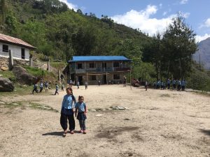 Feeling rested, particularly in my case, we climbed out of Lelep to find a path that generally contoured around the hill overlooking the Timor River far below. After about two and a half hours we reached Sabriti Basic School, a lovely school for a little over fifty children. When we arrived the children were playing on the playground and I was interested to see that there were two games of football taking place. One of the games consisted of girls only. Whilst this is not perhaps uncommon on school playgrounds in the UK, it is the first time I had encountered such activity in Nepal. The school continues to make progress as it embraces the skills and child friendly approach so ably taught by the REED team. The school now benefits from a fresh water supply, part of last year’s initiative to make sure that every school has access to water. On my previous visit I was concerned for the safety of children as they came out of their classrooms as there was a significant vertical drop from the narrow walkway, without any protection. There is now a very sturdy fence, ensuring that children, in their eagerness to go to play, do not fall and hurt themselves.