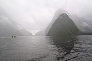 Milford Sound is understandably a favourite tourist destination and everybody who visits South Island has to go there at some point in their travels. It is so worth it. It is one of the wettest places on earth, with up to 700cm of rain a year. With that record, you have to be very lucky to catch it on a perfect, sunny day. We didn’t, but even in the gloomy, and sometimes wet conditions we experienced in the hour and forty minutes we were sailing, it is a truly magnificent and stunning location. The once glaciated valley is now a flooded inlet with water 300m deep. Rising almost vertically from the dark waters are walls of rock, beautifully carved by the forces of nature with imaginative names like Mitre Peak and Lion Peak. Tumbling over these vertical drops were majestic waterfalls, streaks of silver and white, cascading into the sound. The most impressive of these were Stirling Falls, which send plumes of fine spray into the air, guaranteed to give you a soaking as the boats get as close as they can.