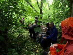 By the time we reached Cheriton, where we were hoping to find somewhere for a lunch stop, it was raining heavily, so we continued a little further, seeking shelter in some woods. They provided little shelter as by now huge drips wall falling on us from the canopy, as well as the rain.