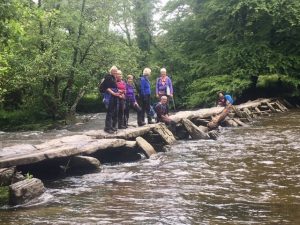 The penultimate day’s walk was the shortest, from Withypool to Simonsbath. A steady climb out of Withypool took us up on to the moor, the grey, damp weather persisting. No sooner had we climbed, then we descended to the River Barle again and followed it all the way into Simonsbath, arriving in good time to visit the pub. Only we were not made to feel very welcome when they asked us to remove our boots. The first three, including Claire who had carried a pair of polythene overshoes, obliged but were then forced to drink up quickly as the others couldn’t be bothered.