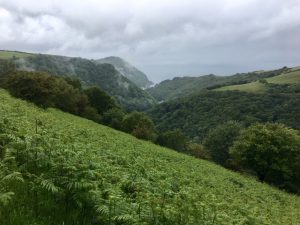 We were now walking high above the East Lyn River. Mist drifted among the trees and clouds fringed the tops of the cliffs. Across the water we could make out the coast of South Wales.