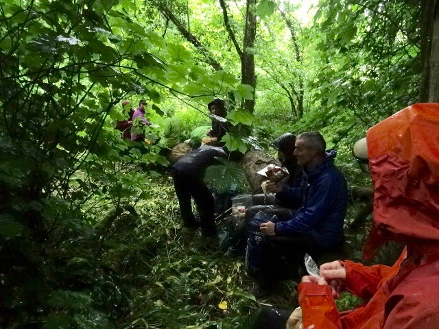 By the time we reached Cheriton, where we were hoping to find somewhere for a lunch stop, it was raining heavily, so we continued a little further, seeking shelter in some woods. They provided little shelter as by now huge drips wall falling on us from the canopy, as well as the rain.