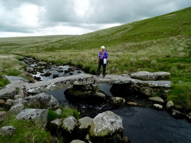 Back on the right track, we descended steeply to a valley with a clapper bridge over the stream. Shortly afterwards we came across the Huntingdon Cross, a 16th C Dartmoor Forest boundary marker.