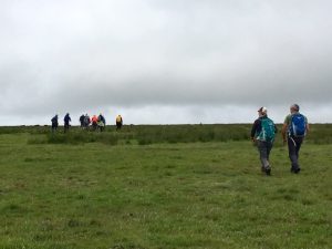 So, coffeeless, we ploughed on. Having followed a delightful section of the River Dart, we began to climb above the valley. As we did so we saw, in the distance, a figure coming towards us. It was Bobby, Claire’s husband, jogging to meet us in his rather lurid green trainers! Showers were all around us but we managed to avoid the worst of them.