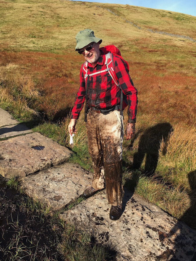 Our walk took us initially parallel to the viaduct and railway until it disappeared into a tunnel under Blea Moor. Standing beneath the stone and brick structure highlighted just how big it is and, looking through the arches framed Ingleborough. Crossing the railway we began our ascent on a good, well used, path, a mixture of stone chippings and well laid slabs of rock. It was easy to walk on and we were making excellent progress, when Mike tripped and fell headlong into the bog to the side of the path. Fortunately he did not hurt himself and once we had ascertained the fact we fell about laughing. He was plastered in wet, black mud. A little further up the path we stopped to sit on some rocks on the summit ridge so that the sun could help dry him off. As we did so a widely spread group of young soldiers were following our route. They were making good progress despite carrying 55lb packs on their backs. The PT sergeant who was well clear of the rest of the group was extremely positive and driven, while some of the squaddies following behind were less enthusiastic and didn’t mind telling us.