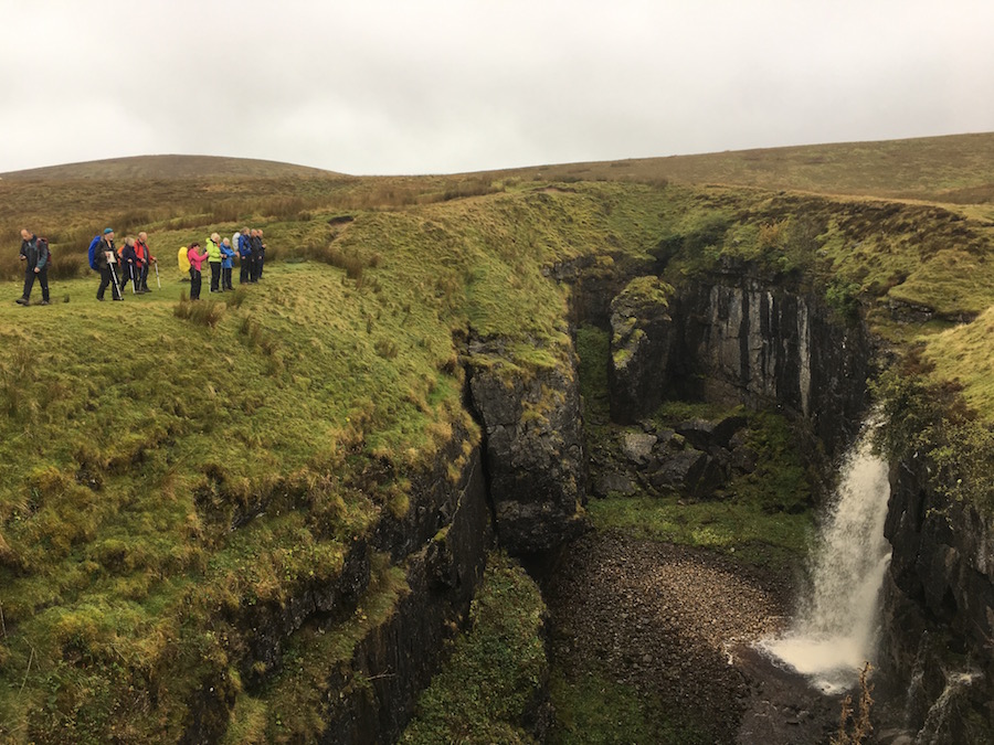IMG_4963It was an easy walk on the Pennine Way, a wide track leading from the village on to the open hill. Immediately on reaching the open hill, Mike suggested we take a slight detour to look at Hull Pot, a former cavern where the roof had collapsed, leaving a large hole into which the river fell before disappearing underground. It is an impressive sight, a classic limestone feature in an area full of classic features – shake holes, limestone pavements, escarpments, pot holes and caverns.